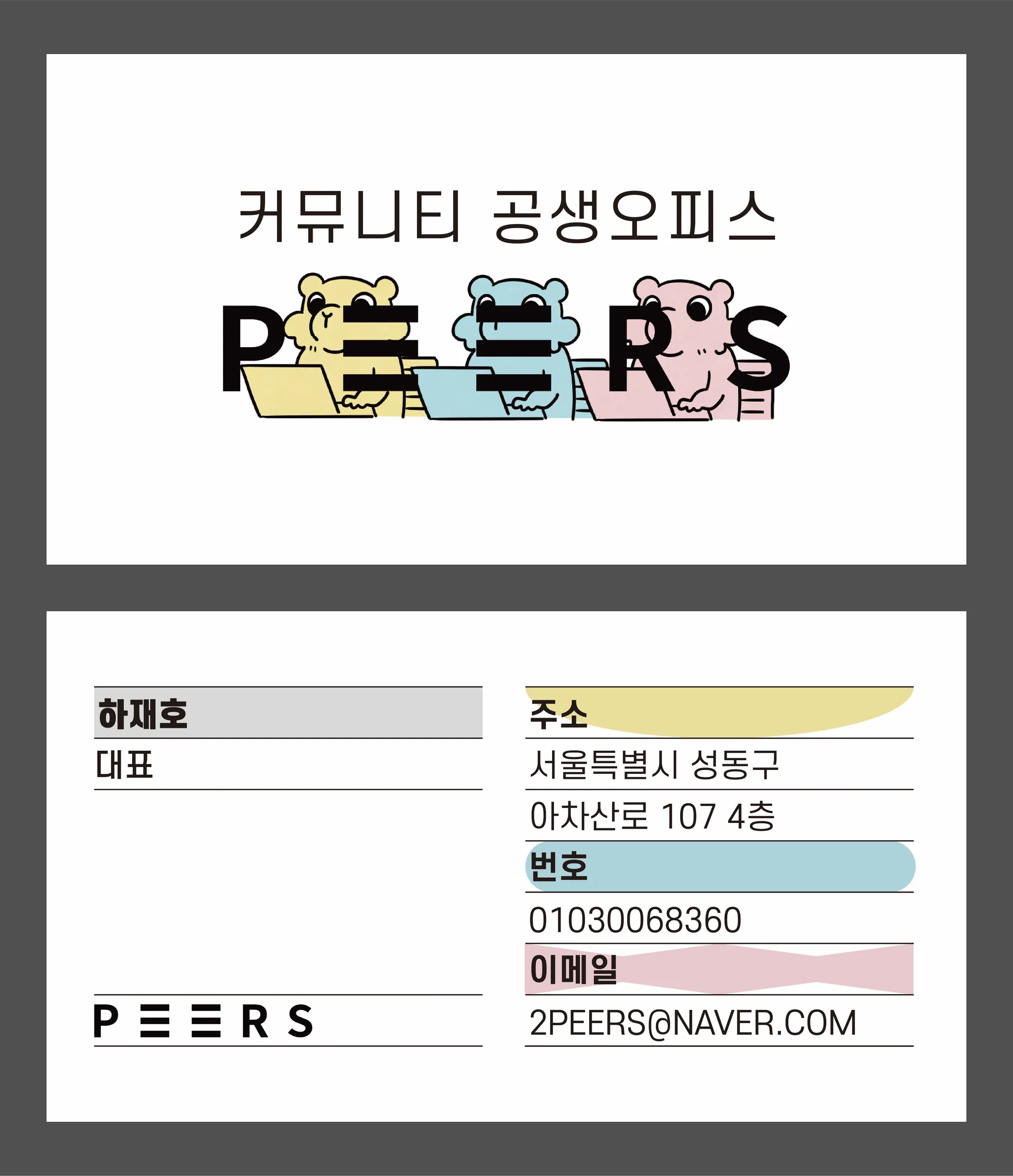 커뮤니티 공유오피스 피어스 | 주소: 서울특별시 성동구 아차산로 107 402호 | 대표자: 하재호 | 사업자등록번호: 203-50-95299 | 대표번호 : 01030068360